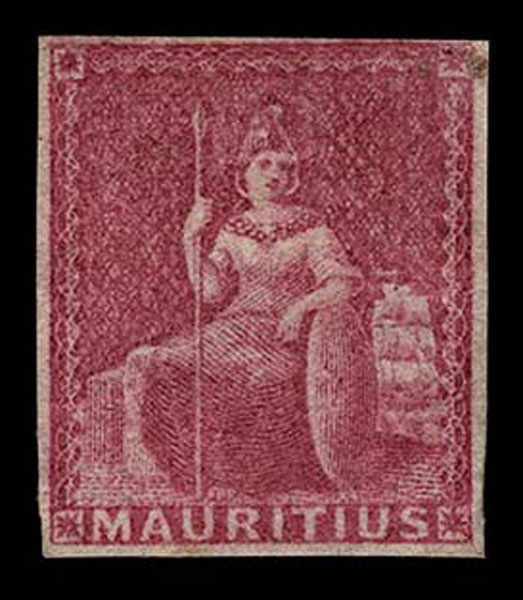 MAURITIUS: 1859; 9p magenta ,part o.g. hinge remnant, margins all around, bright color tiny stain spot , still very fine. (11)… $850