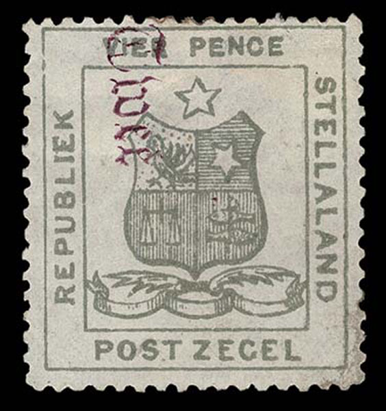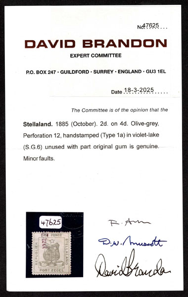 STELLALAND: BECHUANALAND: 1885 “Twei” (2d) on 4d olive green ,part o.g. “minor faults” which seems to be limited to a faint corner crease and some off set on the gum , fine and far better than most. Brandon Cert. (2025). (SG 6 £3,500) (6)… $3,500 in italics