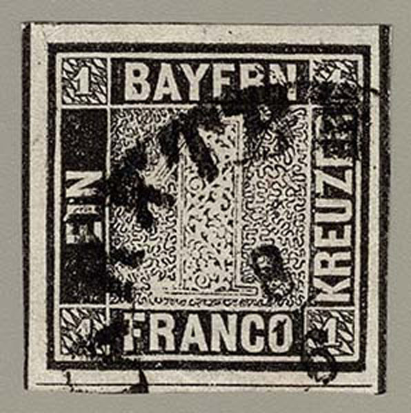 O GERMAN STATES; BAVARIA: 1849 1kr black Plate 1 ,part town cancel, guidelines three sides, ever so faint corner crease in BL margin , still very fine. (1)… $2,250