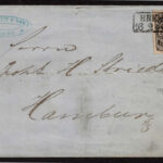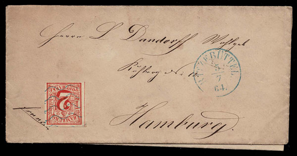 GERMAN STATES; HAMBURG: 1859 2 s red ,margins all around showing dividing line at left cancelled by blue 5 wavy-line cancel on off white envelope, with enclosure, bearing blue RITZEBOTTEL 5-7-6 4 c.d.s., on reverse HAMBERG receiver . (3)… $800