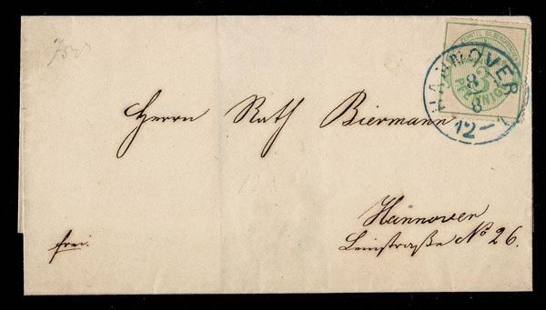 GERMAN STATES HANNOVER: 1863 3pf green, well centered ,perforations clear at left, tied by neat blue HANNOVER 8-8 12-1 c.d.s. on off-white envelope . (17)… $4,000