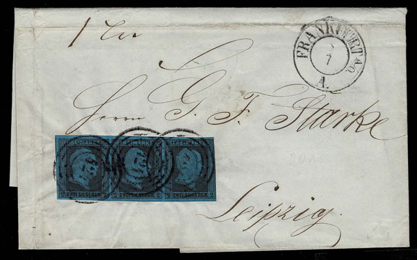 GERMAN STATES; PRUSSIA: 1850-56 2 SG black on blue, Strip of Three ,good margins three sides just in at right, tied on 1855 folded letter sheet (bit wrinkled) by “424”in target cancel, bearing FRANKFURT c,d,s, to Leipsig .