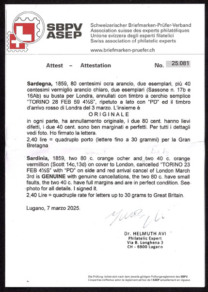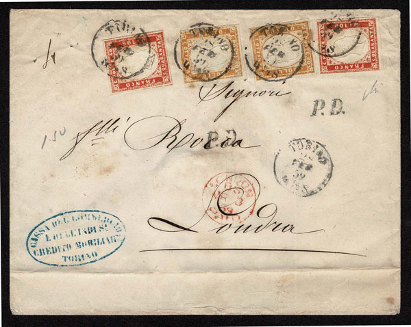 ITALIAN STATES: SARDINIA; 1859 80c (2), small faults, 40c (2),orange ocher and orange vermillion on cover to London ,tied by “TORINO 23 FEB 4 1/2 S” c.d.s. with “P.D.” with red arrival cancel and blue company marking on reverse . Avi Cert.( 2025)
