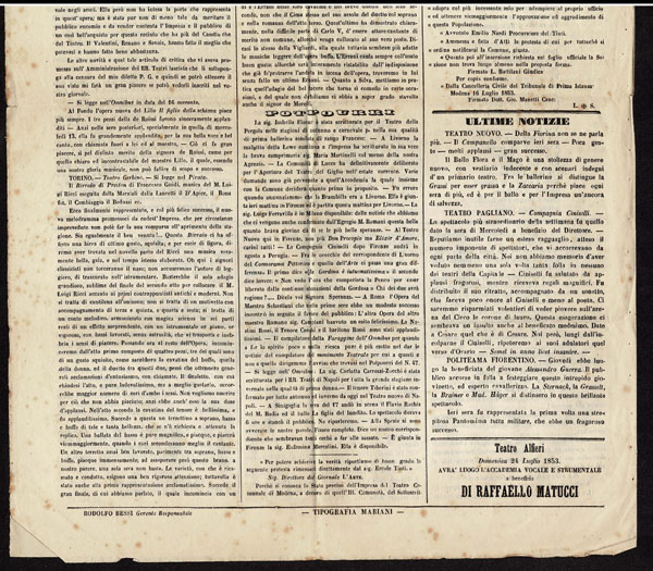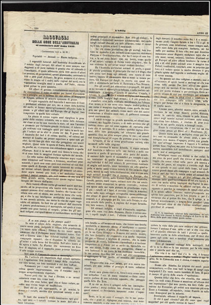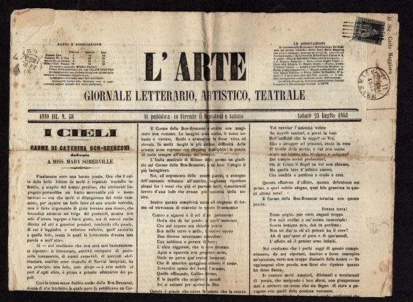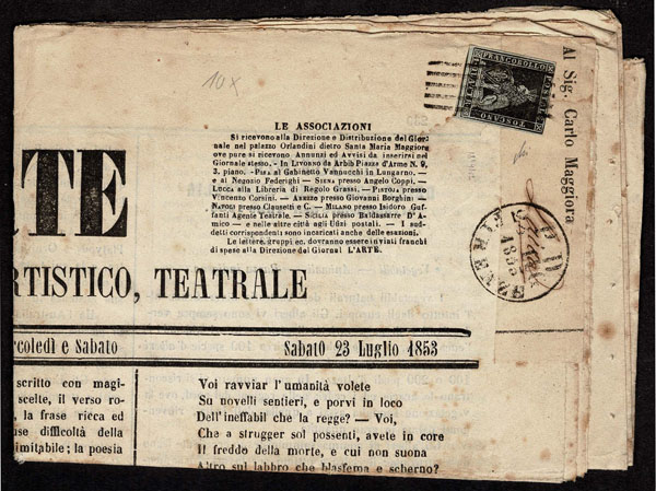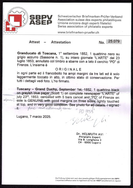 ITALIAN STATES: TUSCANY;1852 1g black on grayish blue paper ,margins three sides, just in at top, tied on the front page of the complete four page newspaper, L ‘ARTE GIORNALELETTERARIO, ARTISTICO, TEATRALE bearing FIRENZE 23 LUG 1853 origin and 25 LUG 1853 receiver postmarks, An appropriate paper for a work of art. Just lovely . Avi Cert.( 2025) (Sannone 1 27,400) (1)… $12,000