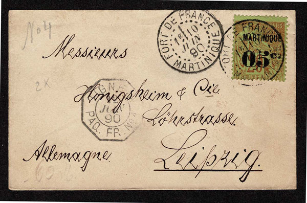MARTINIQUE used to GERMANY: 1888 05c on 20c red on green ,neatly tied by FORT DE FRANCE MARTINIQUE 10 JUN 90 c.d.s. on petite envelope bearing PA Q FR NO A 12 JUIN octagon, to Lupzig . (13)… $375