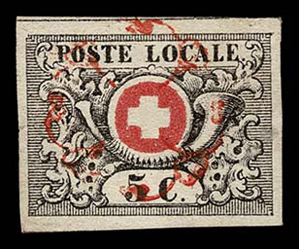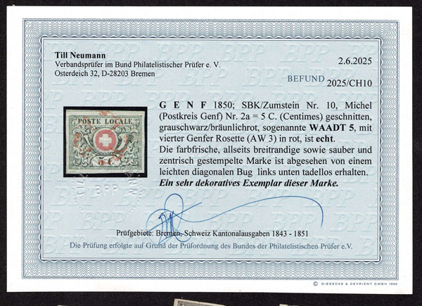 O SWITZERLAND: Geneva (GENF); 1850 5 Centimes, black and red ,red cancel, margins all around, dividing line at top, “perfect condition” “except tiny crease” which we can not see , very fine. Neumann Cert. (2025). (2L6)… $1,950