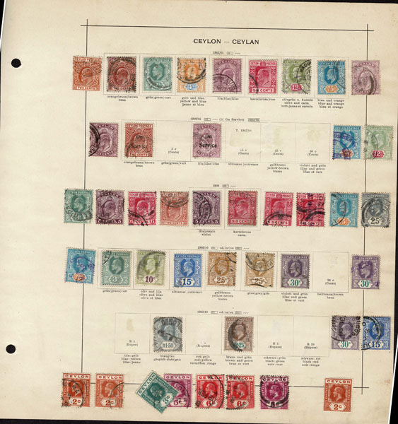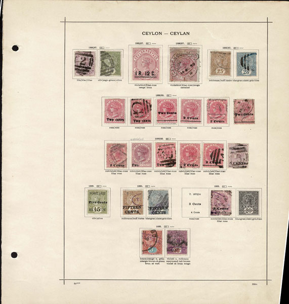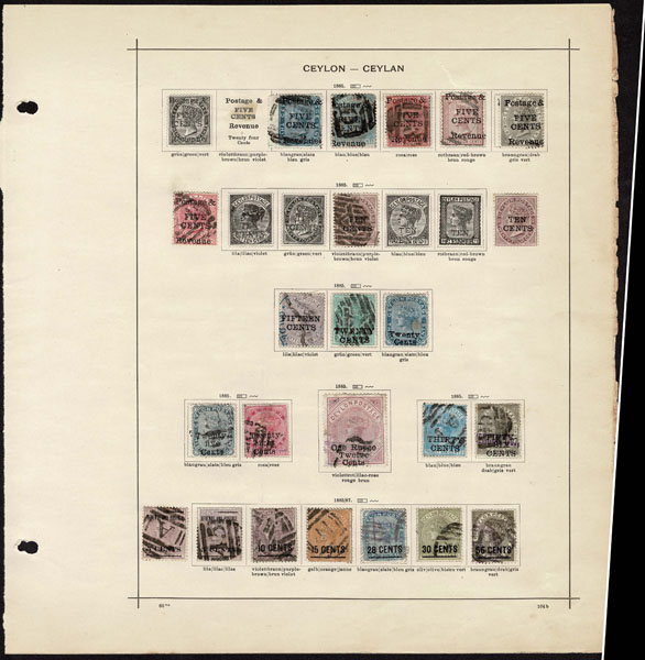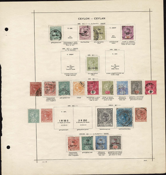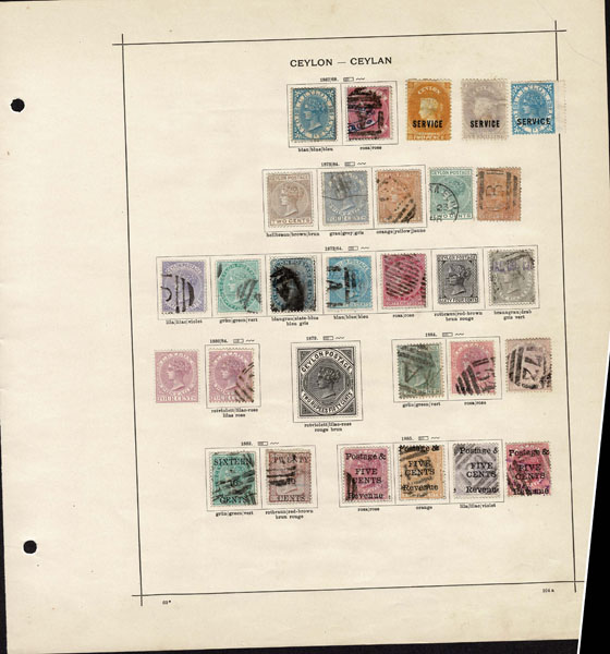 /O CEYLON: 1857 to 1910 Collection of 180 mostly used stamps on old time Schaubeck album pages ,few imperfs, good surcharges, some stuck down by old time hinges (should not affect used stamps) condition mixed but worth the effort to work the collection .